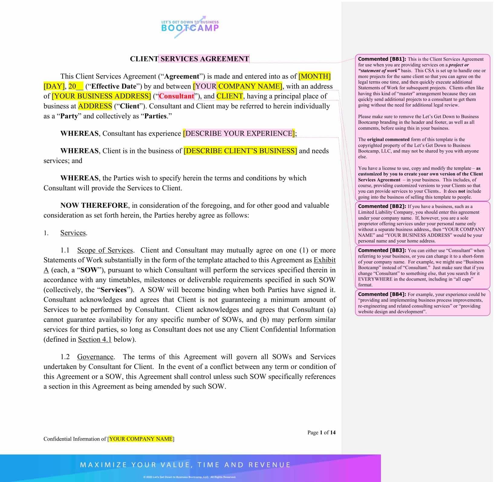 That’s one of the main reasons why I decided to put together this easy-to-use, “Fill-in-the-Blank Customizable” Client Services Agreement with Statement of Work template…